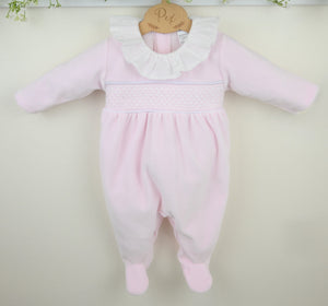 Bluesbaby Blue Smocked Velour All In One with Rocking Horse Detail