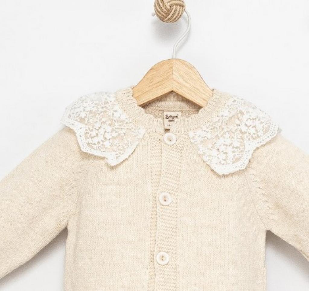 Knitted cardigan with lace collar. Leggings with matching headband.