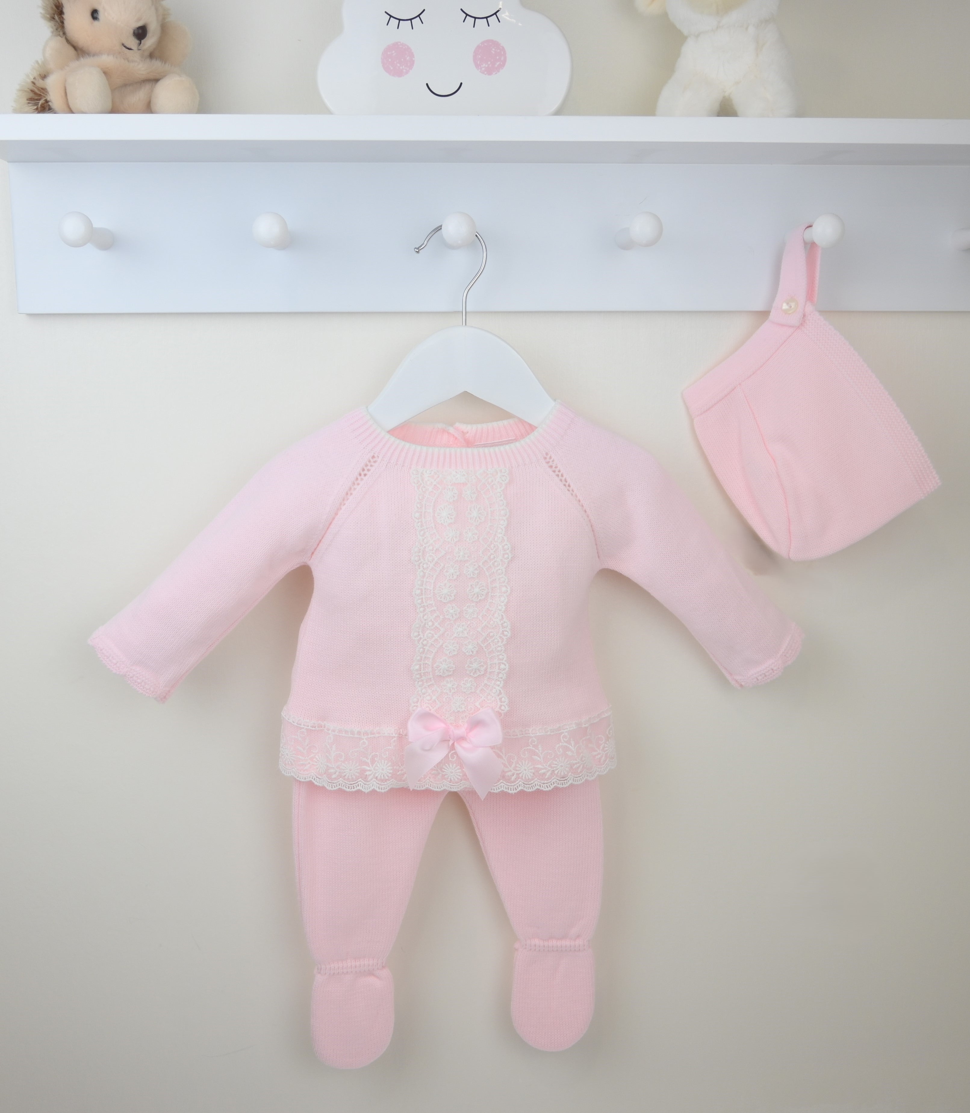 Pex Knitted outfit with matching bonnet, lace detail to the front of the top with bow detail in the centre. Elasticated trousers with feet in.