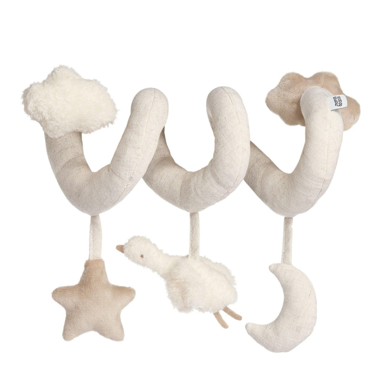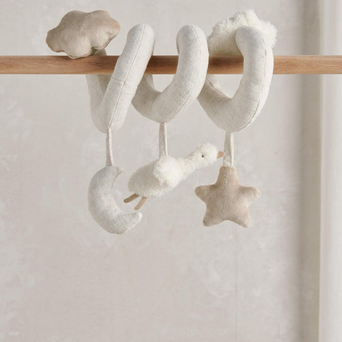 Our playful little Duckling comes to life when attached to their pushchair or carry cot! They’ll have a quacking good time shaking, rattling, squeaking and crinkling it to their hearts content. Made from touch-me textured borg fabric with super soft cloud and moon detail.