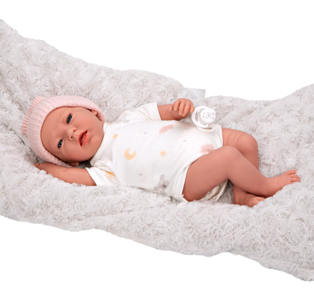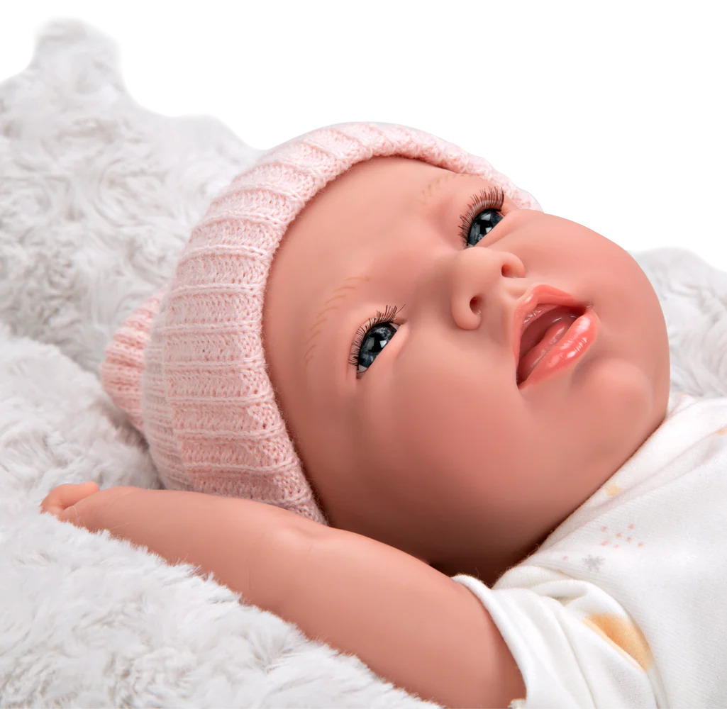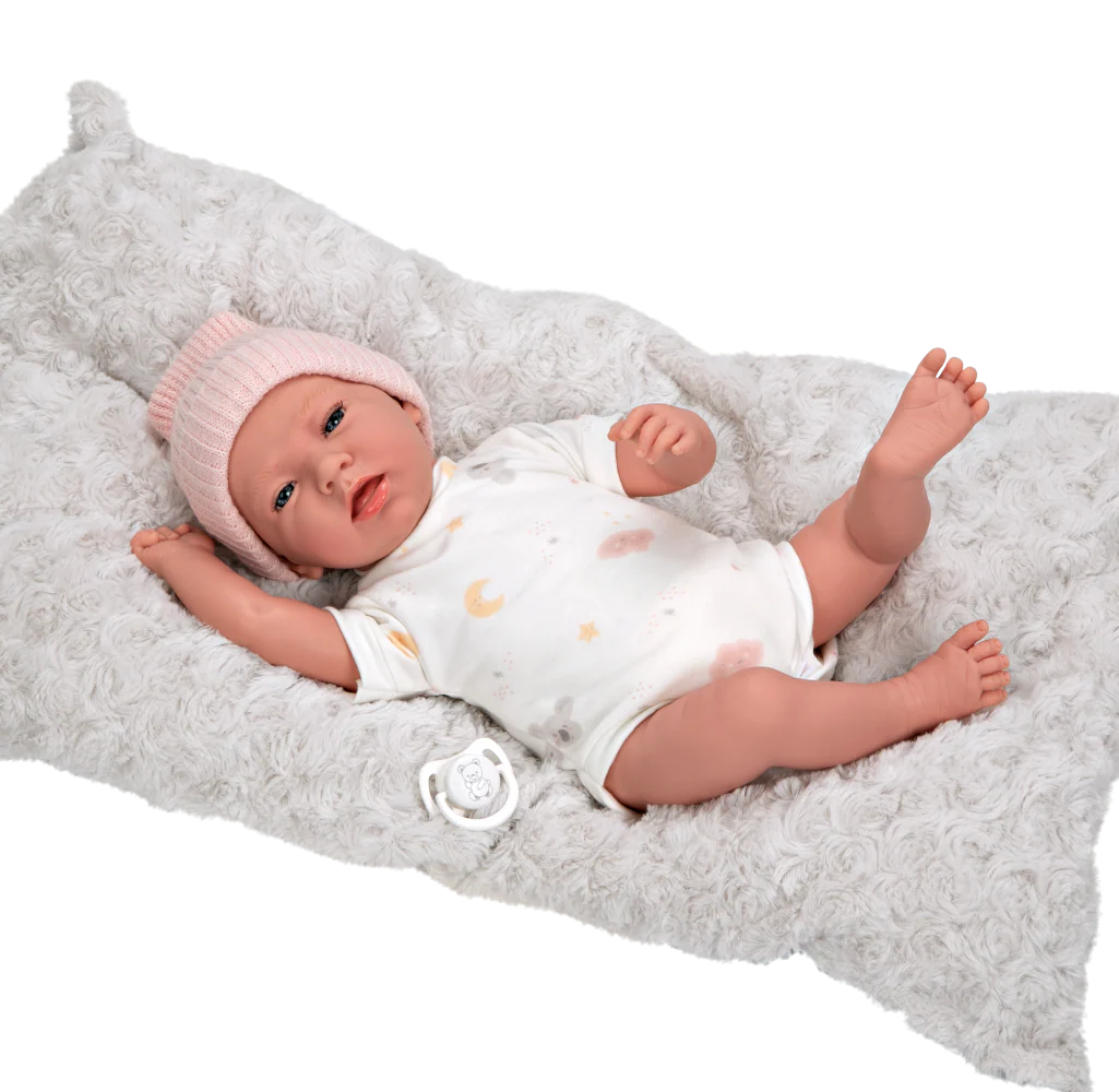 This special baby can’t wait for you to rock her to sleep on her fluffy cushion at nap time. Daphne weighs the same as a real baby and gives off a soft vanilla scent thanks to the vinyl material of her limbs and head. Her pyjamas, hat and blanket are made of high quality fabrics. Includes a dummy.
