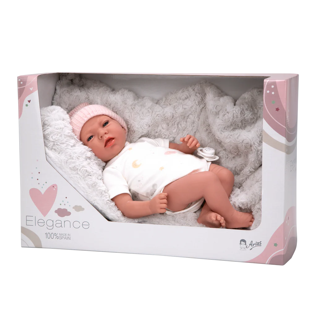ELEGANCE 40 cm doll DAFNE dressed in light coloured printed pyjamas. Its weight is so realistic that it feels like a real baby. Includes cushion and dummy.